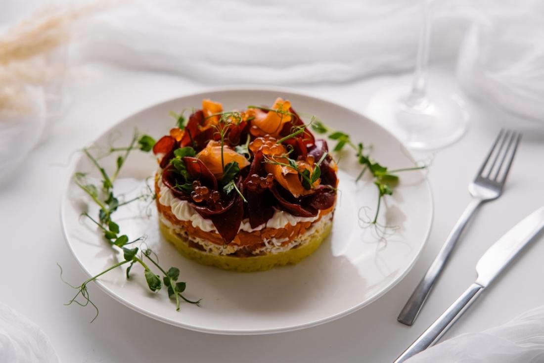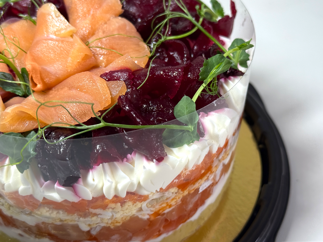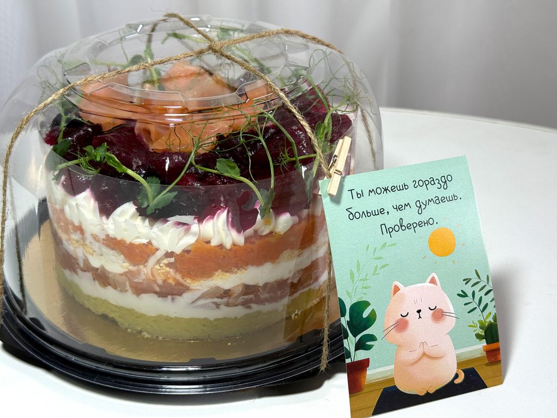 Салат в виде торта. Состав: форель м/с, картофель отварной, морковь отварная, свёкла отварная, яйцо куриное, соус майонез, микрозелень.