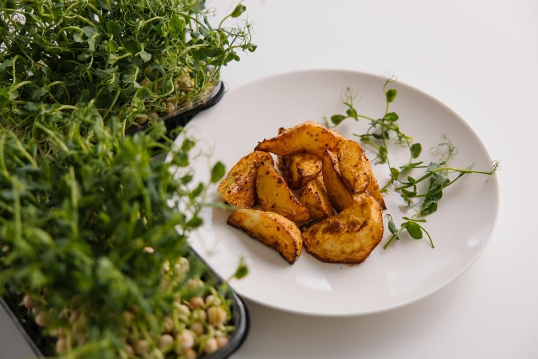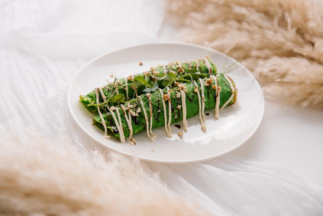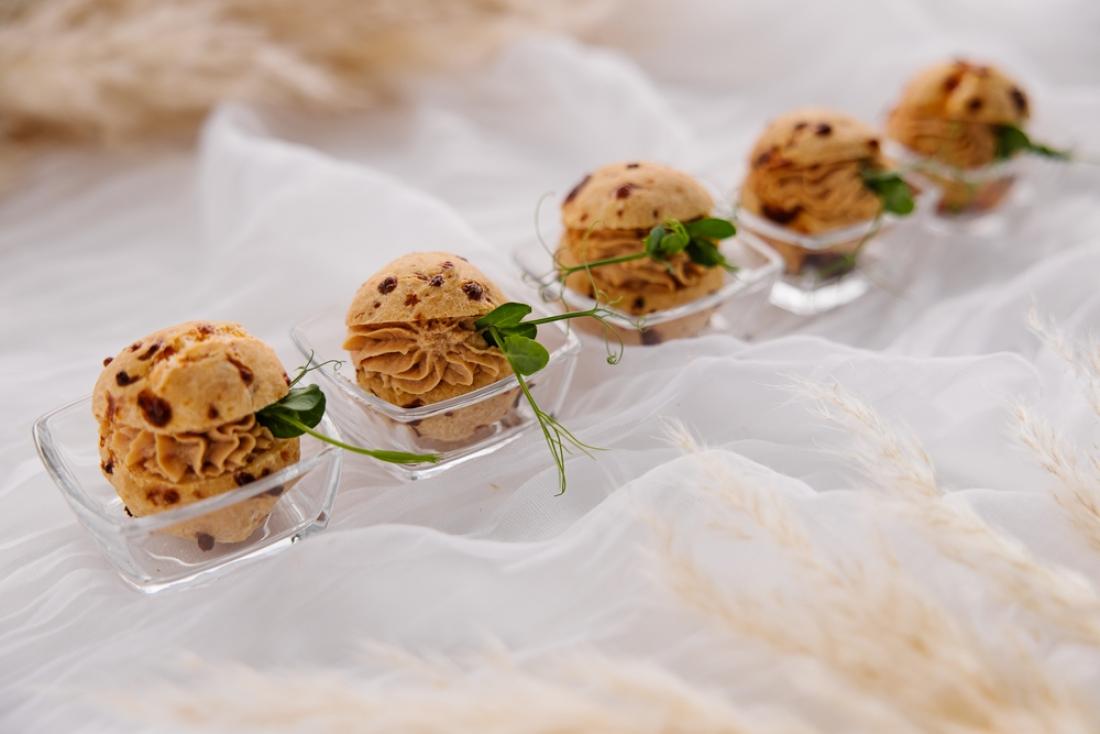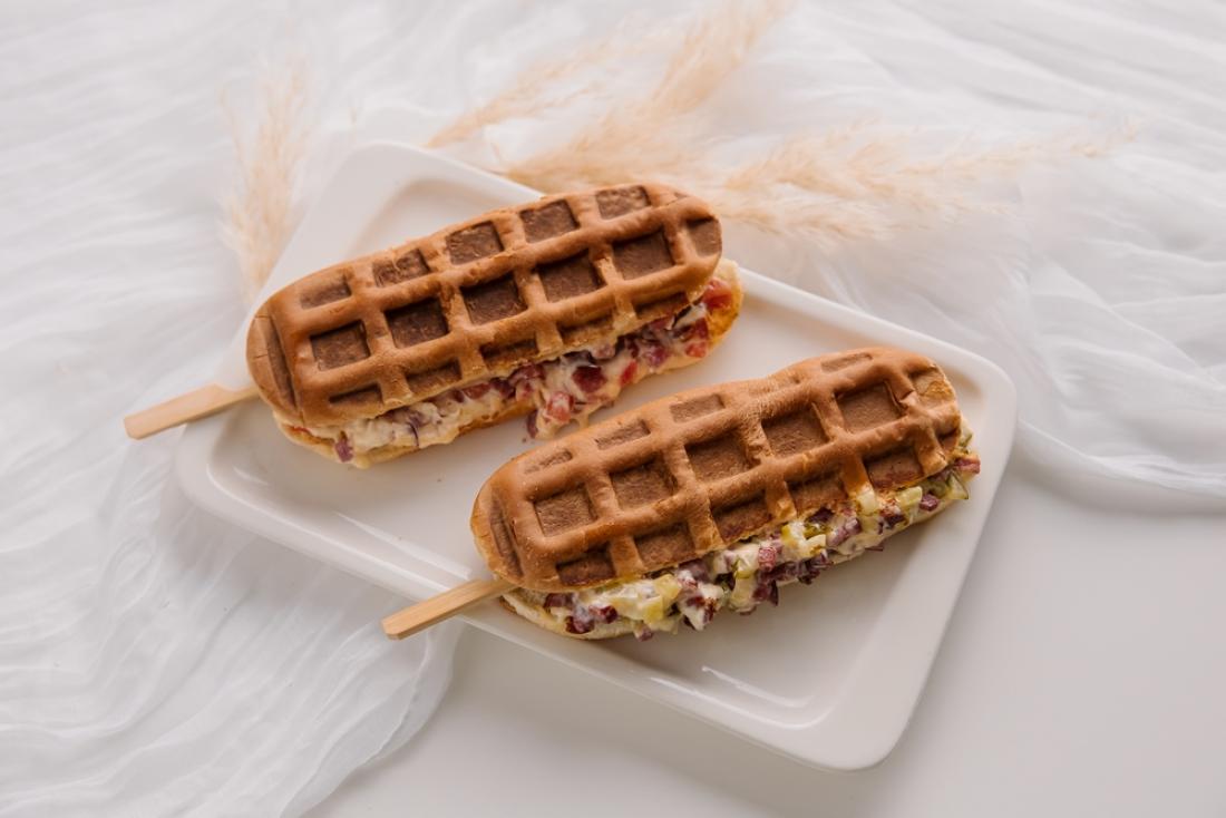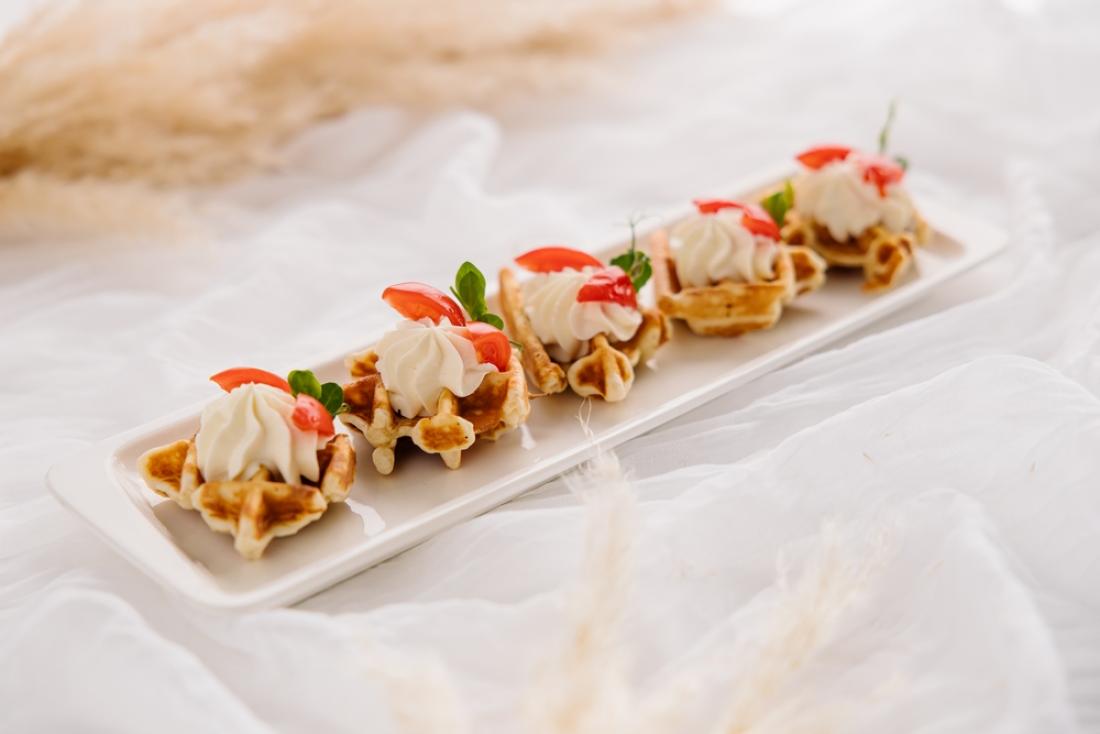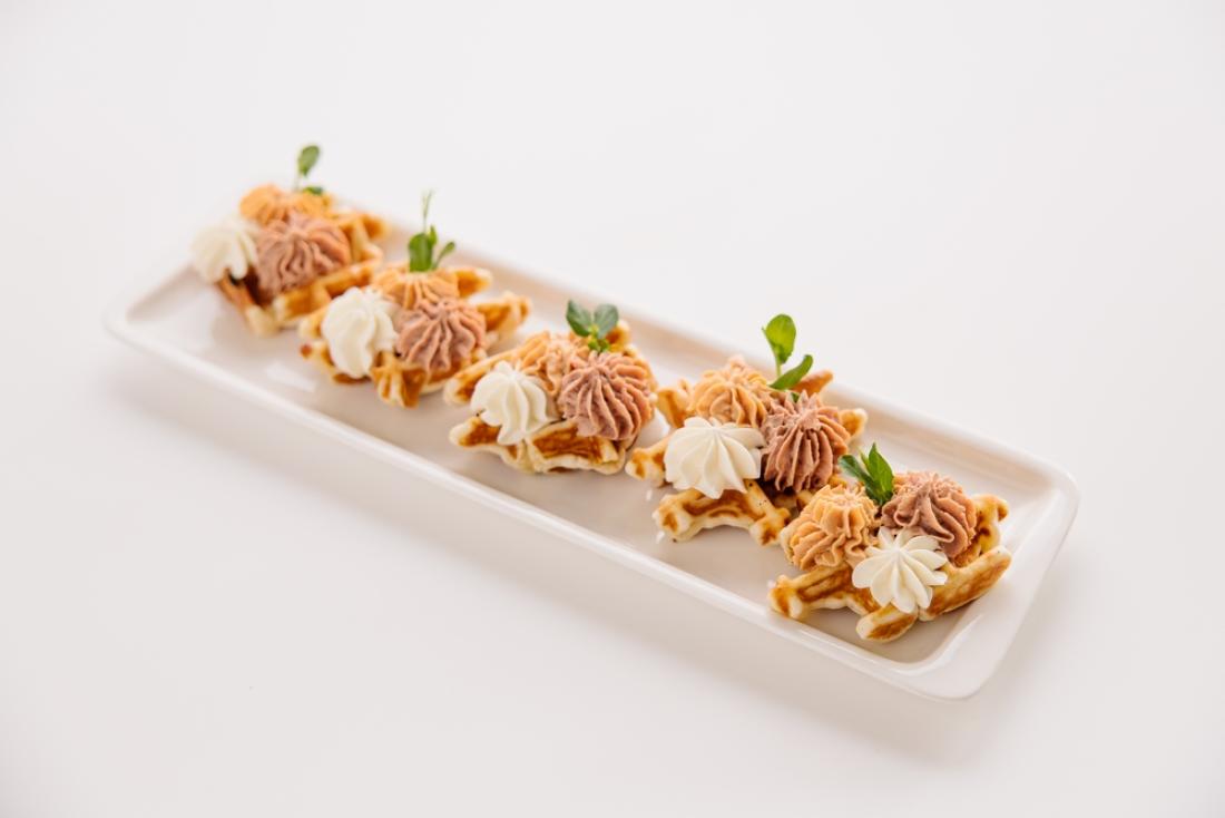 Венские вафли, паштет из мяса марала собственного приготовления, сыр творожный, микрозелень.