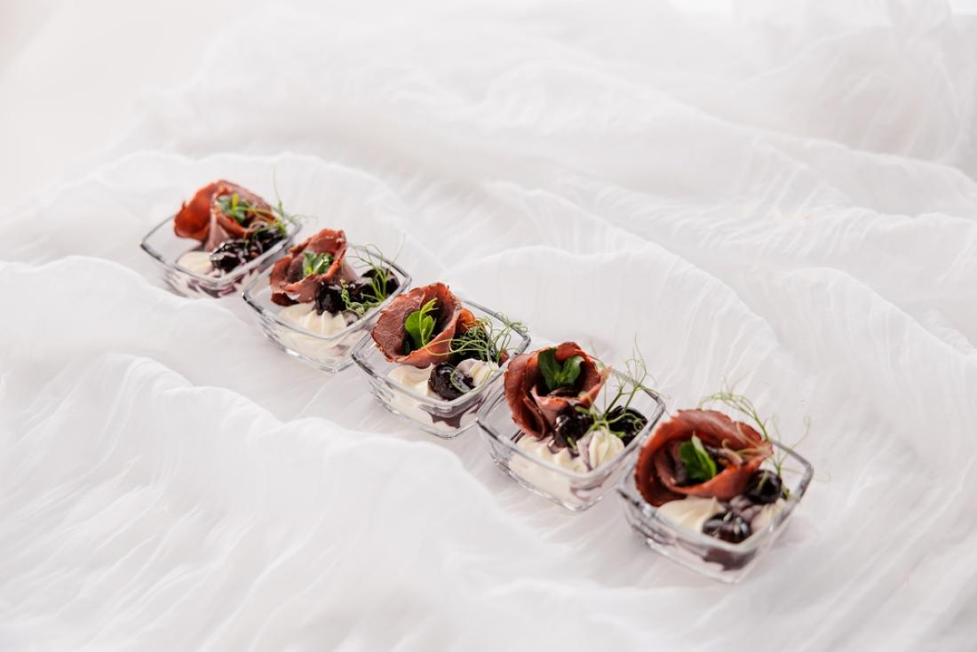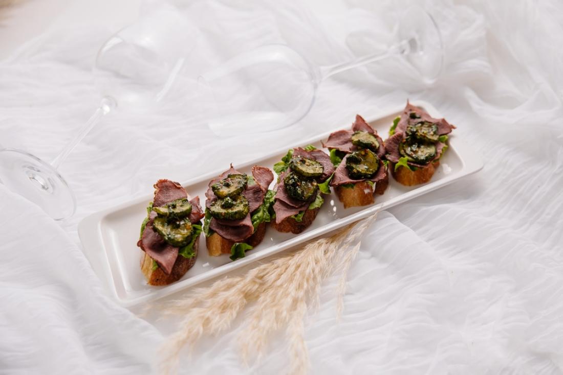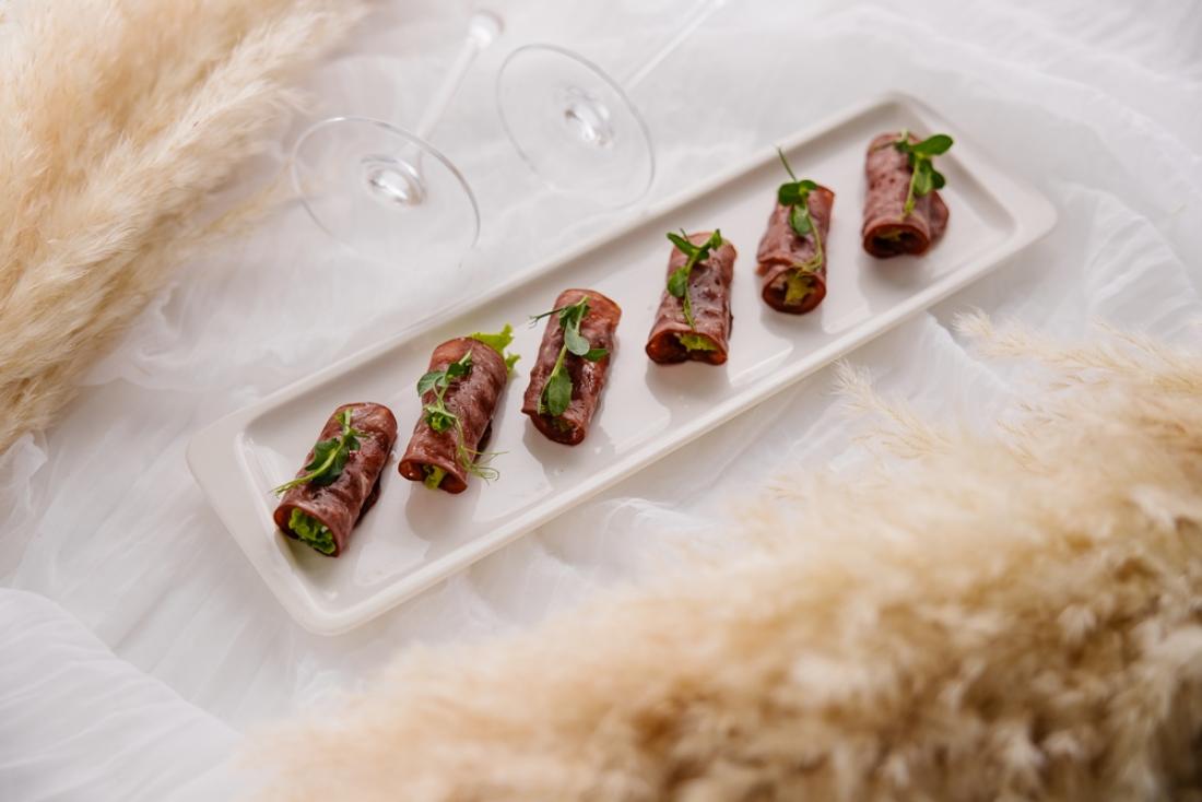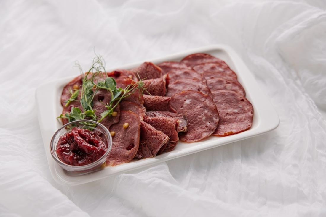 Мясо марала варёно-копчёное собственного приготовления, черри, огурец свежий, соус гранатовый. От 5 шт.