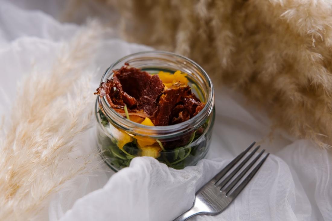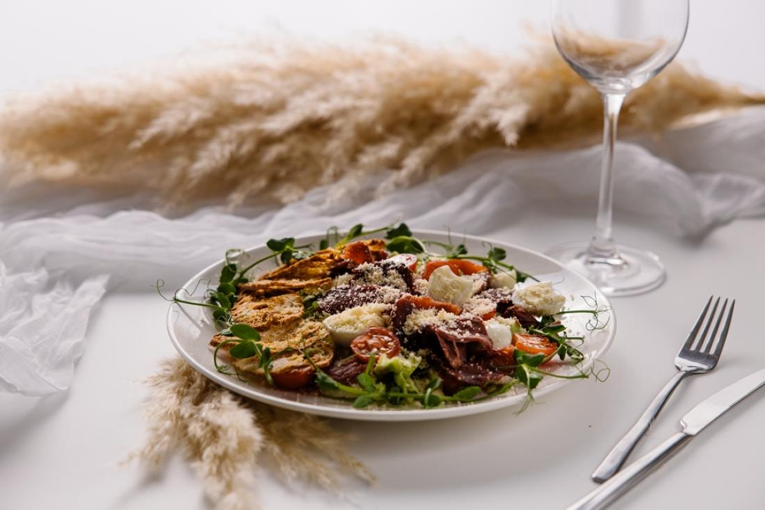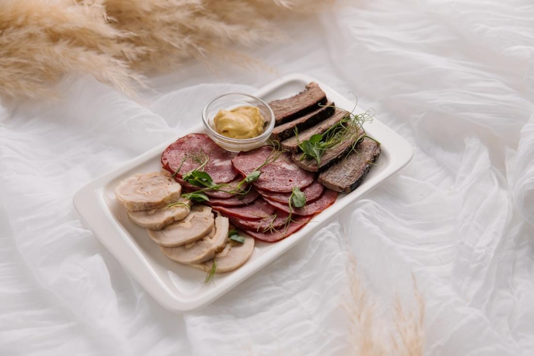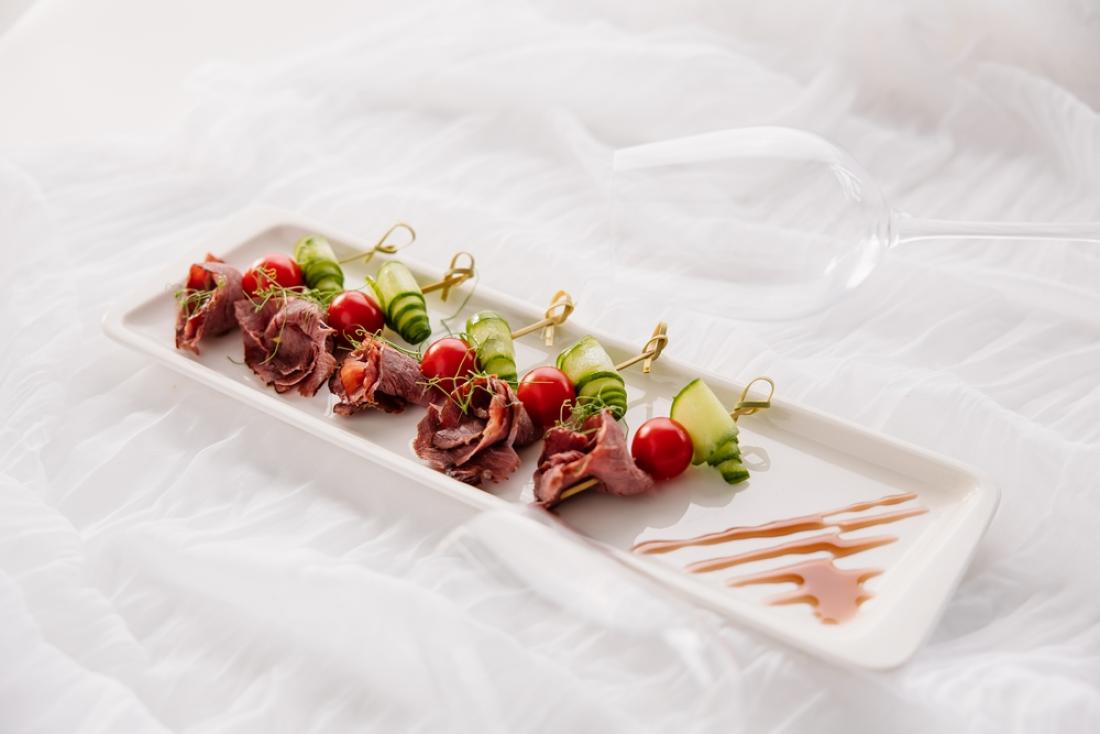 Мясо марала варёно-копчёное собственного приготовления, черри, огурец свежий, соус гранатовый. От 5 шт.