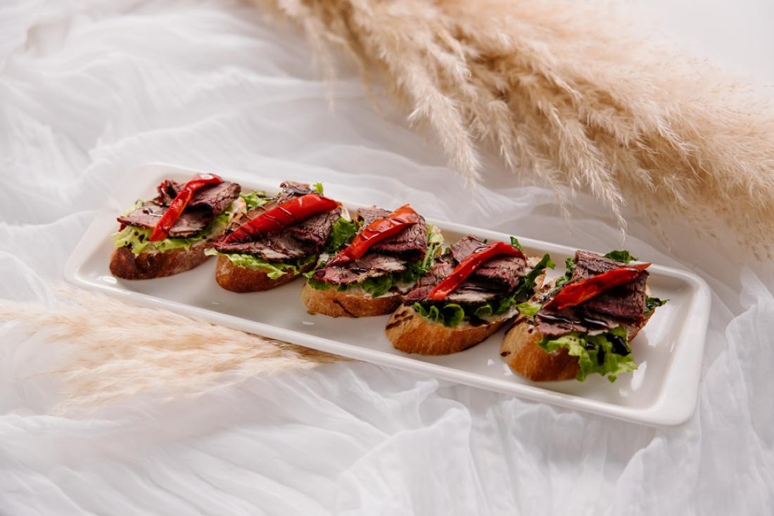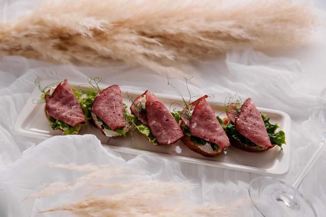 Ветчина из мяса марала и свинины собственного приготовления, сыр творожный, сливки, салат "айсберг". От 6 шт.