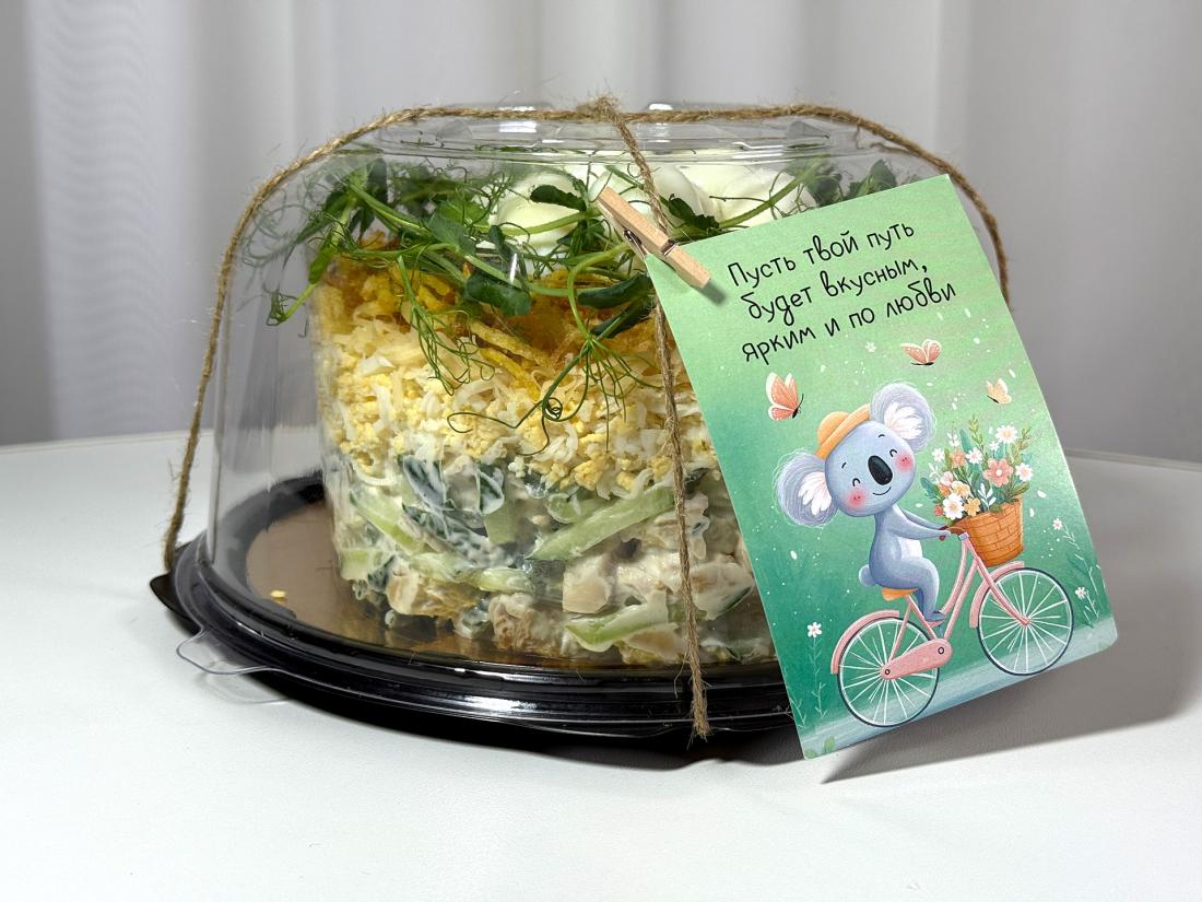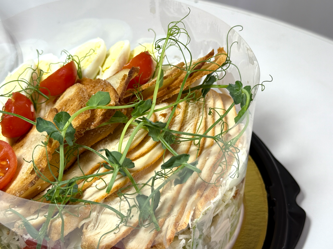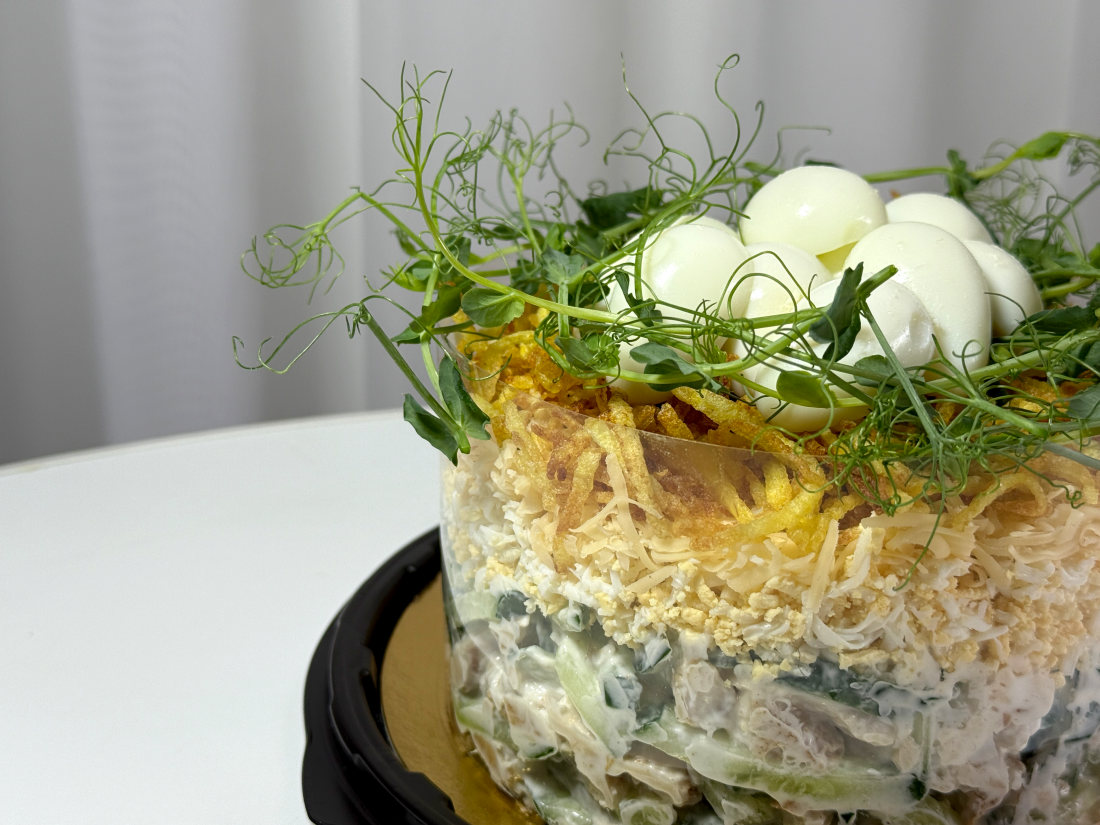 Салат в виде торта. Состав: куриное филе гриль, огурец свежий, яйцо куриное, яйцо перепелиное, пай, сыр российский, соус майонез, микрозелень.