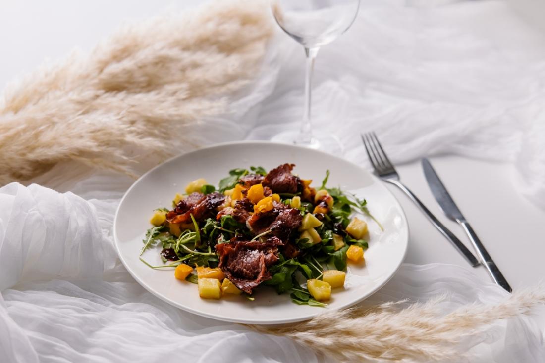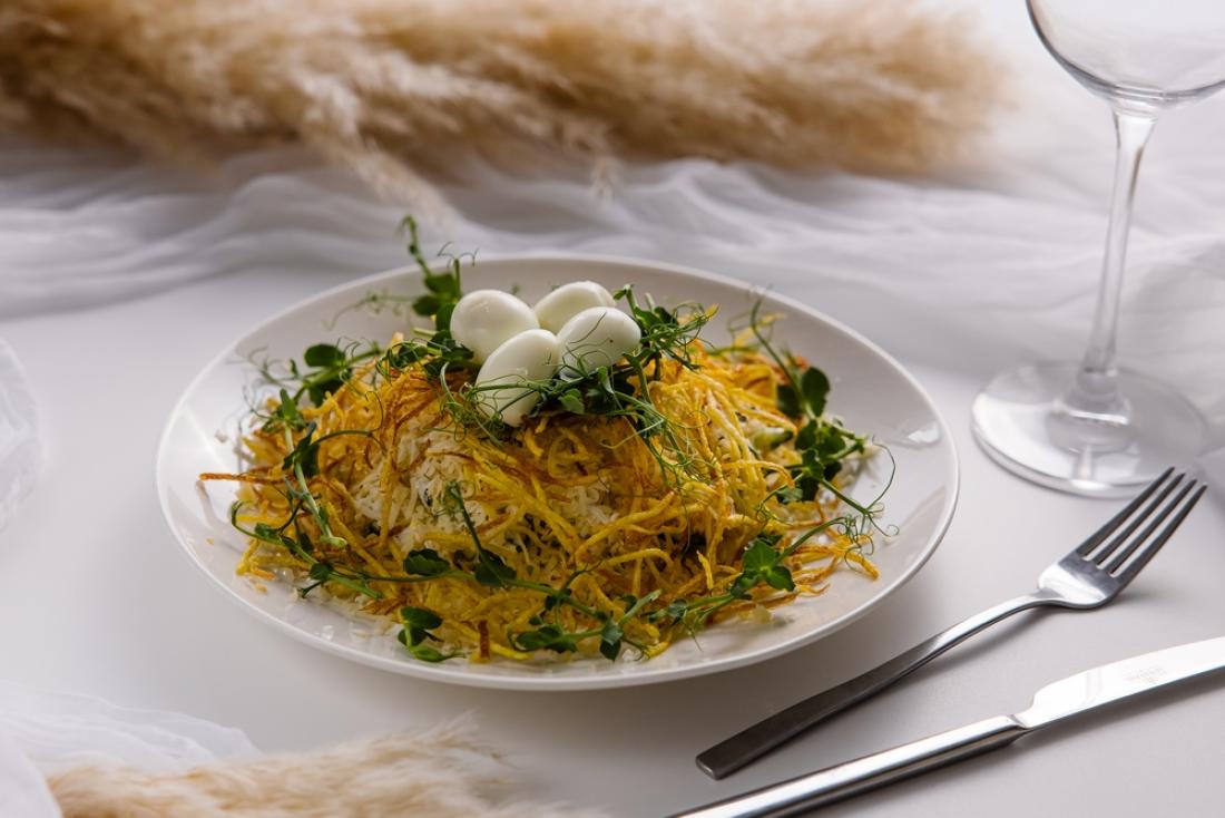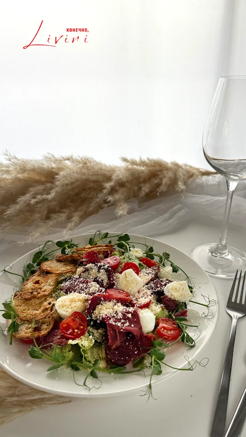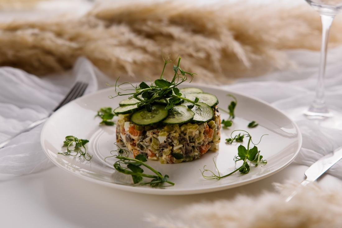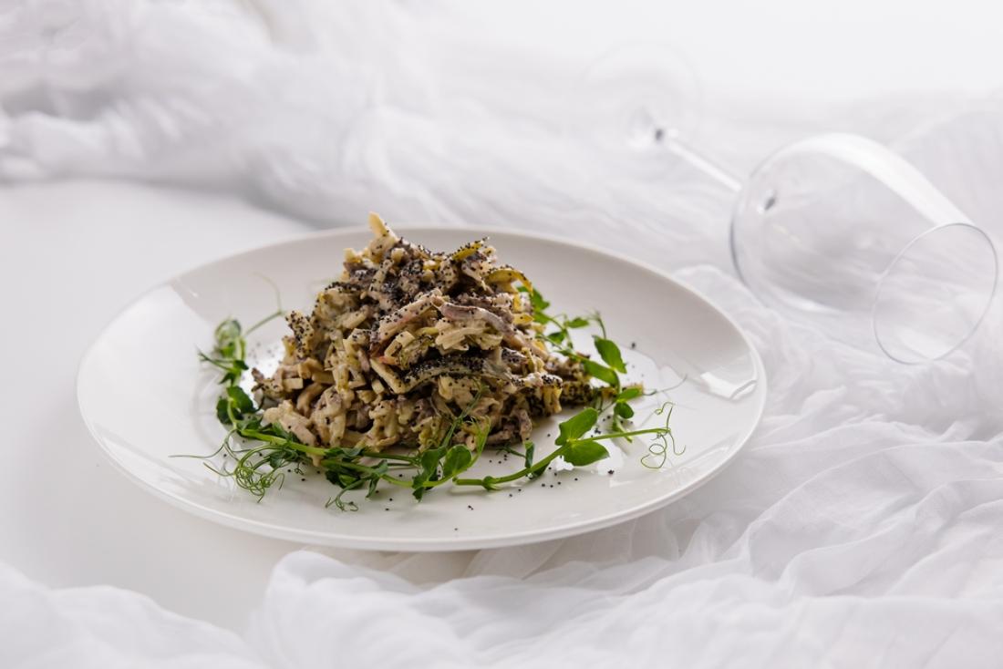 Филе куриное отварное, говядина отварная, корнишоны, зелёное яблоко, мак, соус сливочный, микрозелень.
