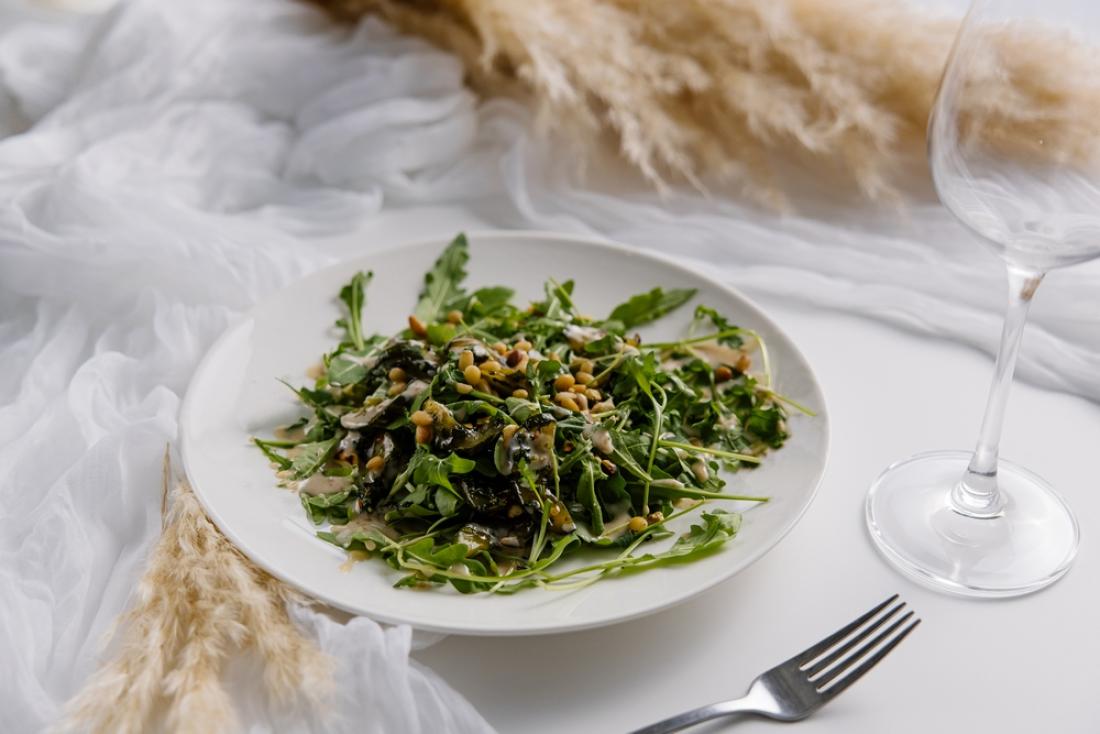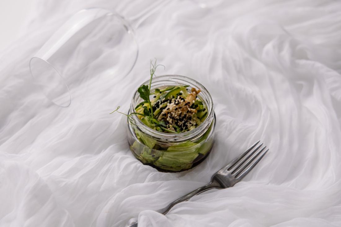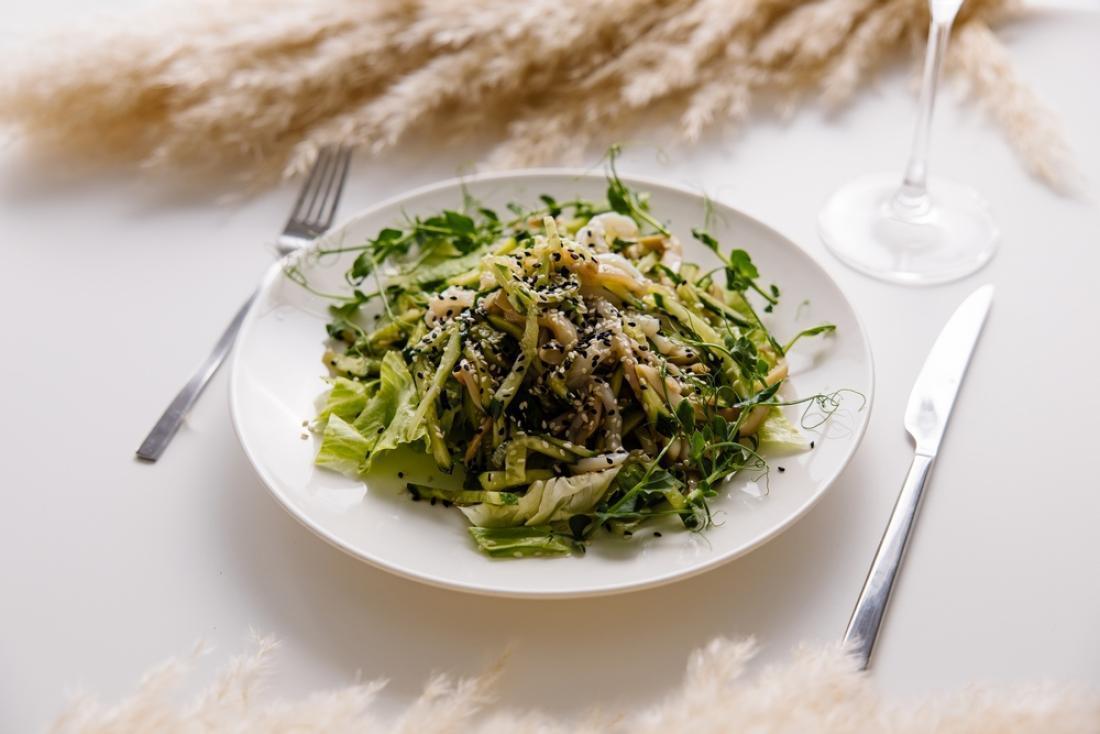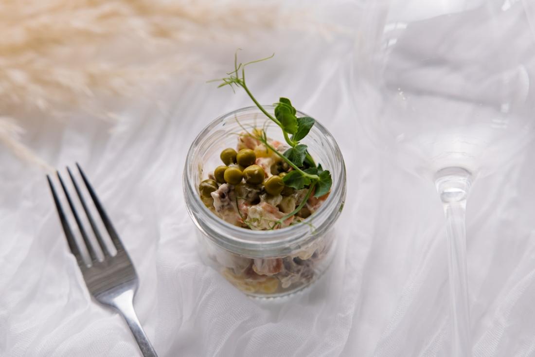 Филе куриное отварное, говядина отварная, корнишоны, зелёное яблоко, мак, соус сливочный, микрозелень.