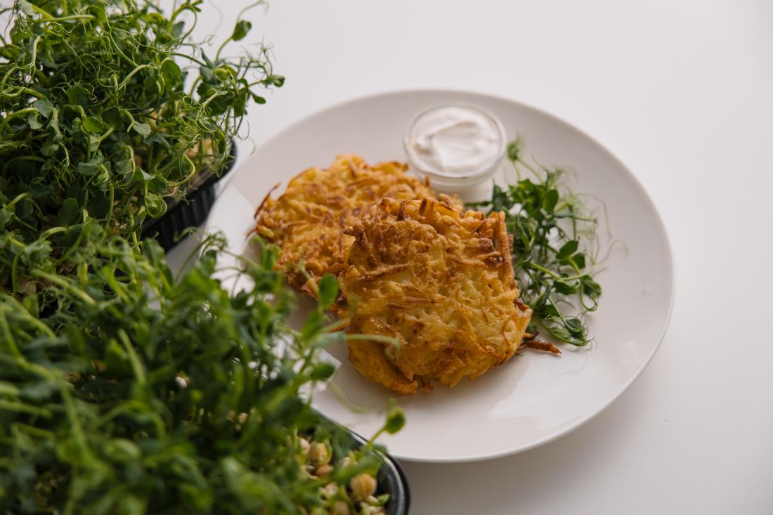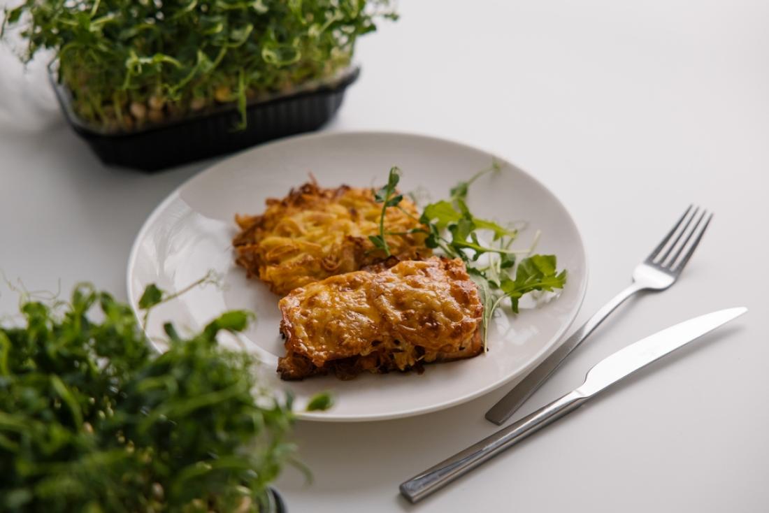 Филе форели, морковь, лук, помидор, запеченные под сыром. Картофельные драники, зелень.