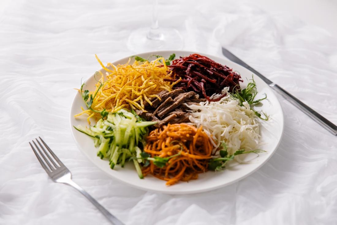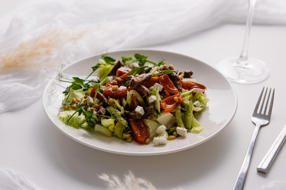 Мясо говядины жареное, морковь-ча, свекла-ча, капуста б/к, огурец свежий, пай, соус майонез, микрозелень.