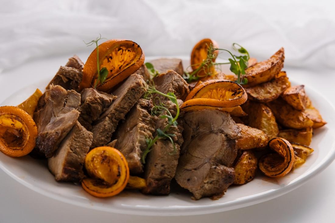Свиная шея маринованная в горчично-апельсиновом соусе , ароматный картофель,соус брусничный, зелень. Блюдо рассчитано на 4-5 персон.