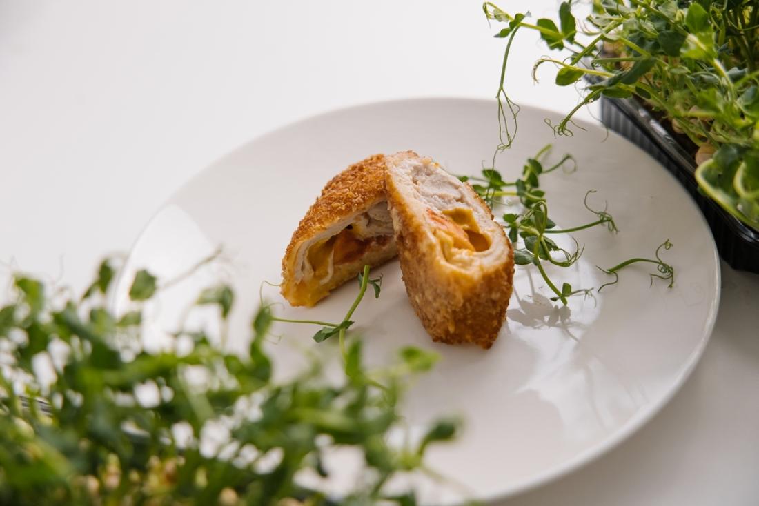 Нежный куриный рулетик панированный в сухарях "панко" с начинкой из сыра Чеддер и помидором,зелень