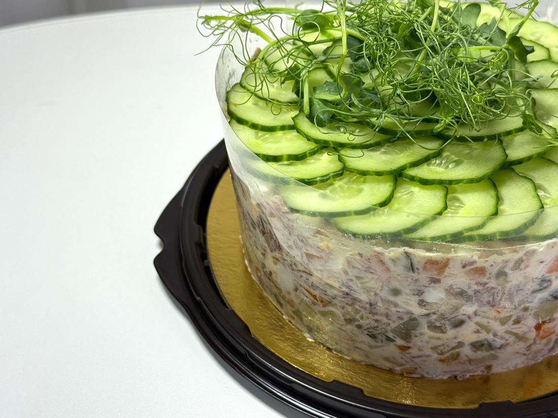 Салат в виде торта. Состав: говядина отварная, картофель отварной, морковь отварная, корнишоны, яйцо куриное, горошек консервированный, соус майонез, микрозелень.