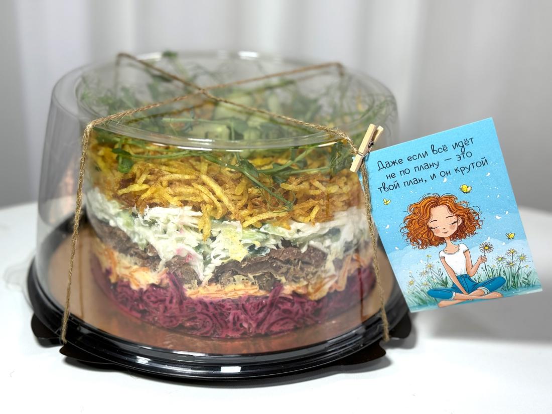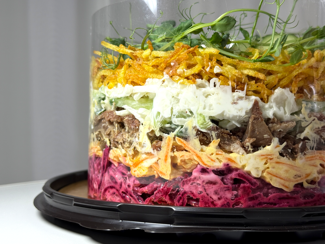 Салат в виде торта. Состав: мясо говядины жареное, морковь-ча, свекла-ча, капуста б/к, огурец свежий, пай, соус майонез, микрозелень.