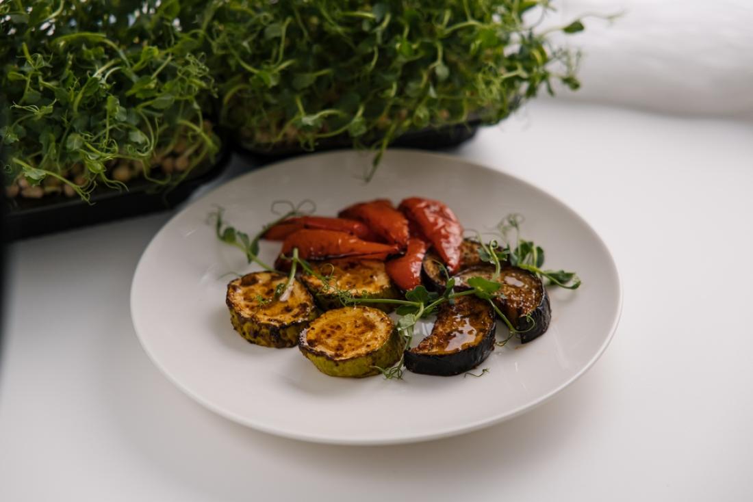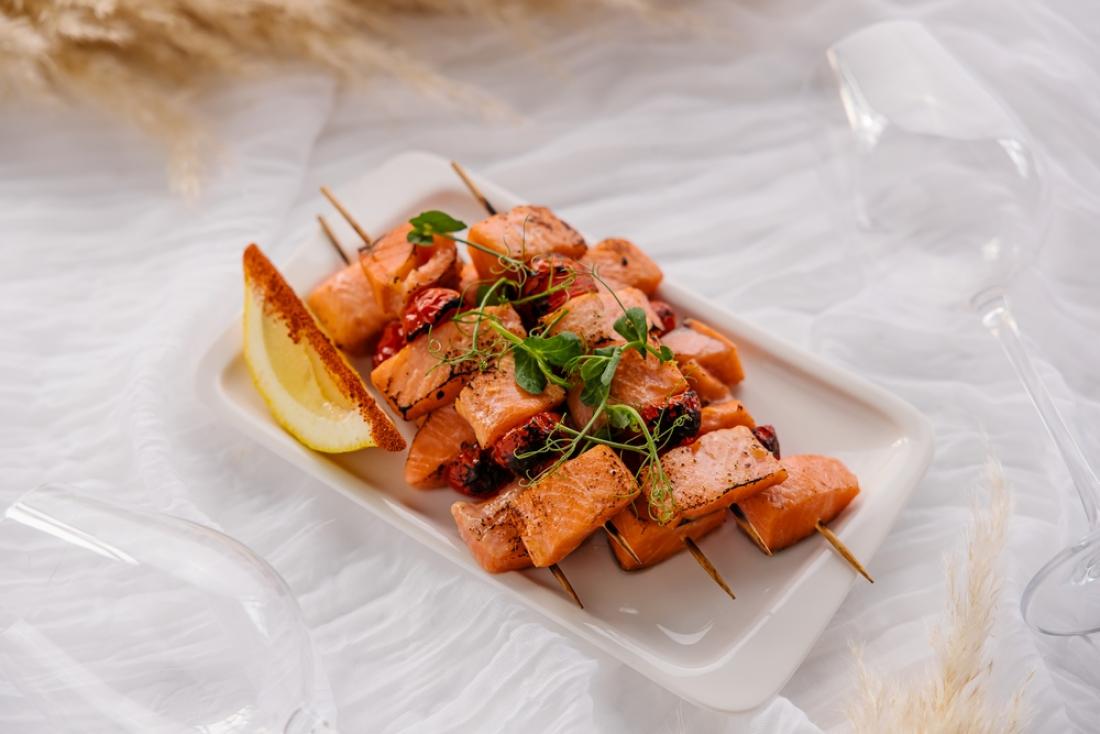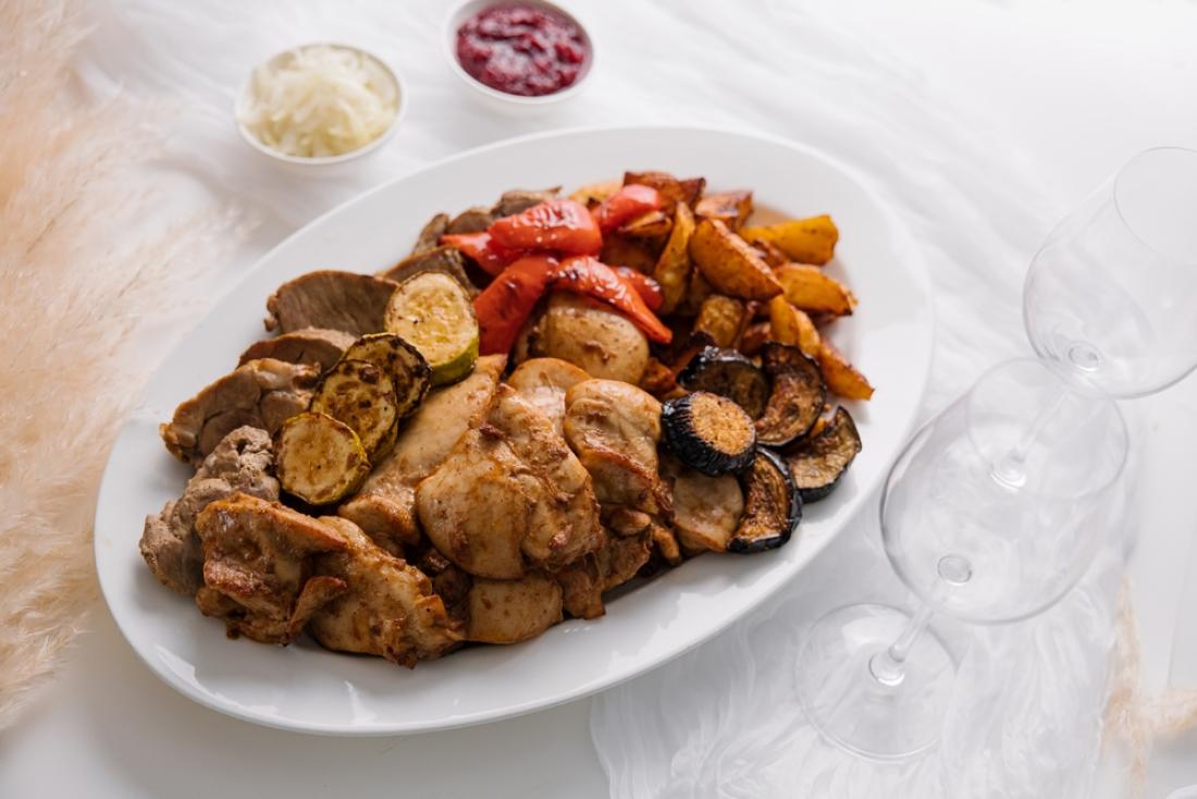 Свинина шея томлёная, шашлык из филе бедра, ароматный картофель, овощи гриль, зелень, соус брусничный, лук маринованный.