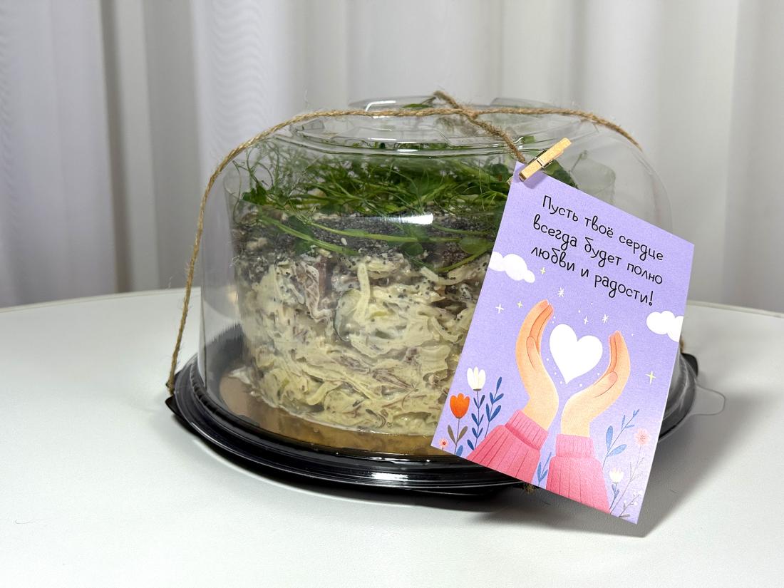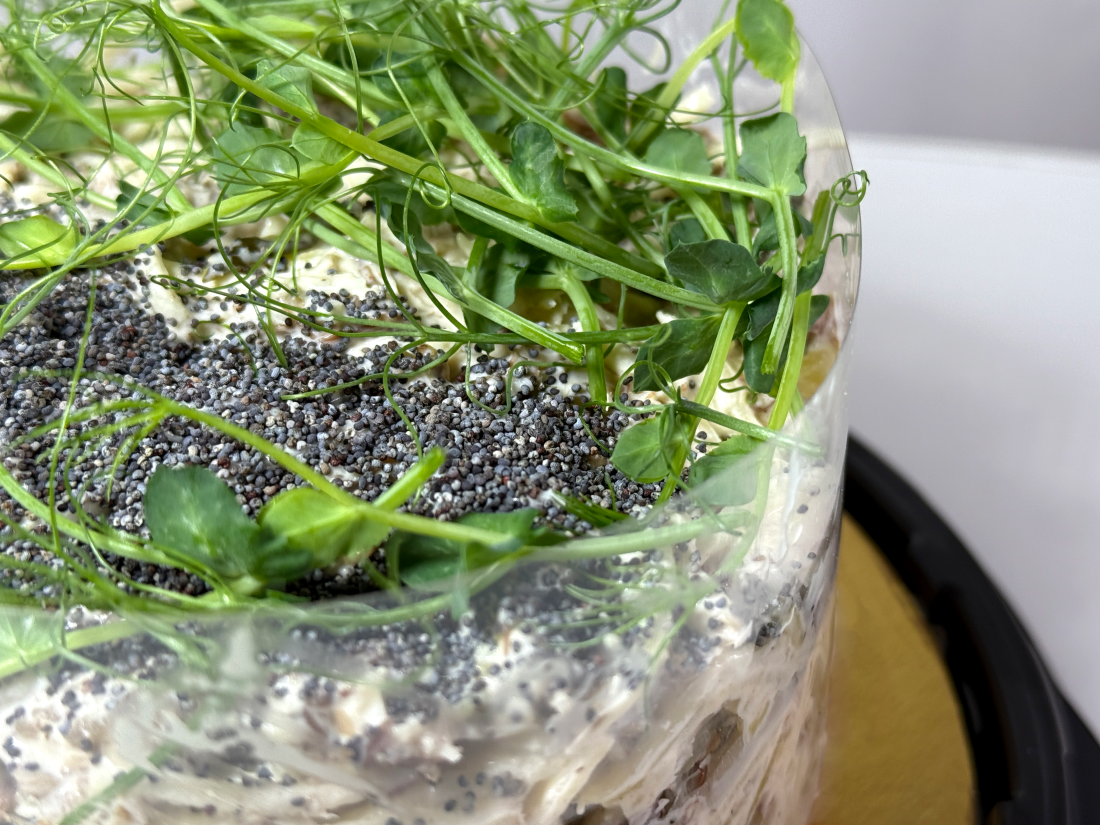 Салат в виде торта. Состав: филе куриное отварное, говядина отварная, корнишоны, зелёное яблоко, мак, соус сливочный, микрозелень.