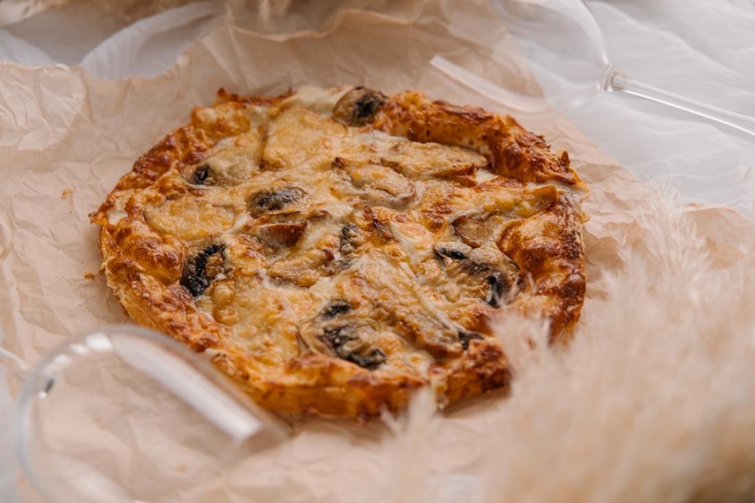 Тесто, курочка гриль, сыр пармезан, сыр Моцарелла, майонез, маслины, шампиньоны свежие.