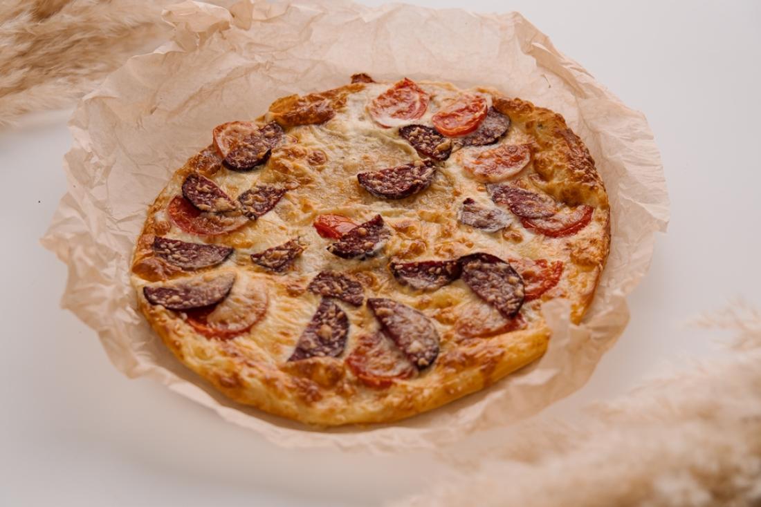 Тесто, сервелат собственного приготовления, помидоры, сыр пармезан, сыр Моцарелла, майонез.