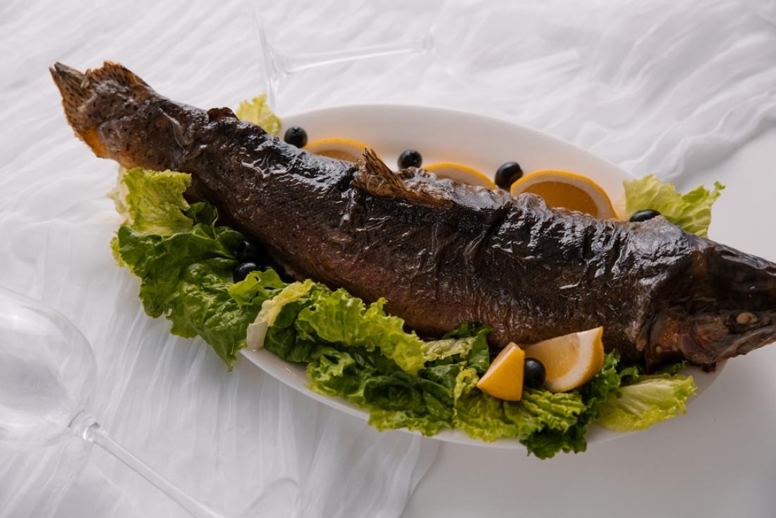 "Форель Саянская, фаршированная свежими шампиньонами, рисом. Лимон, маслины, зелень. Блюдо рассчитано на 7-8 персон."
