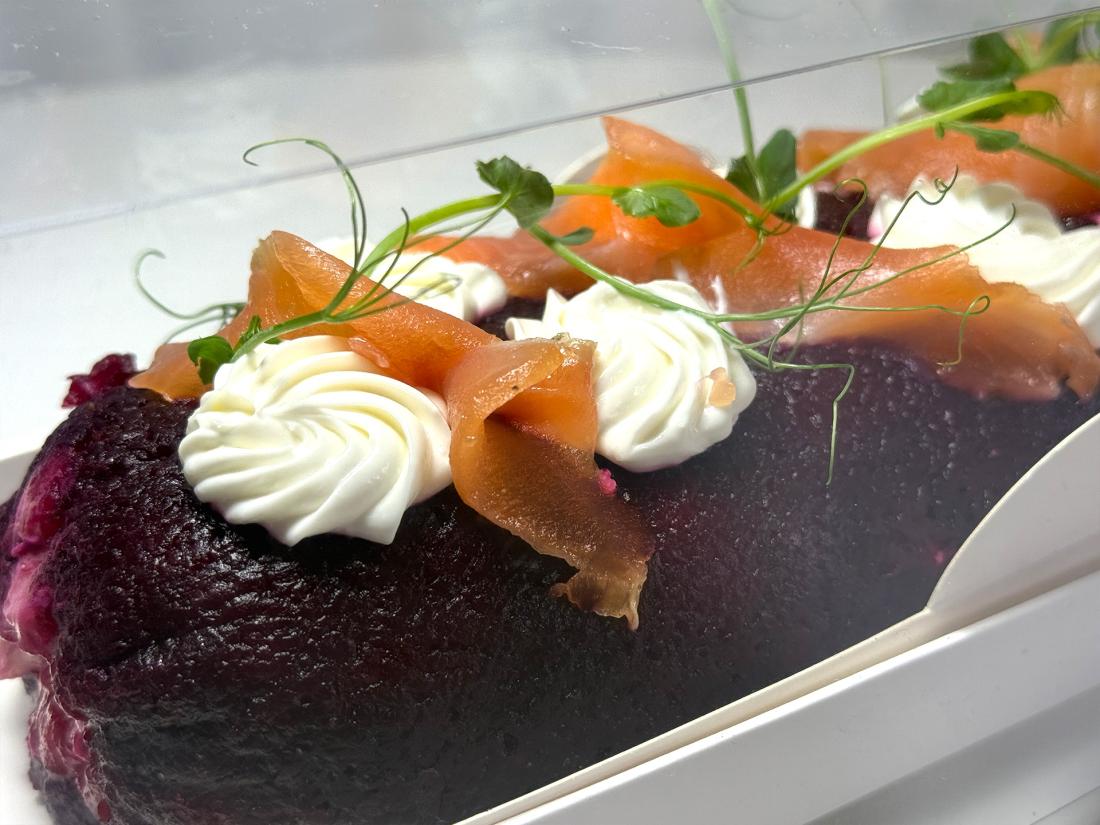 Салат в виде рулета. Состав: форель м/с,картофель отварной, морковь отварная, свёкла отварная, яйцо куриное, соус майонез, микрозелень.