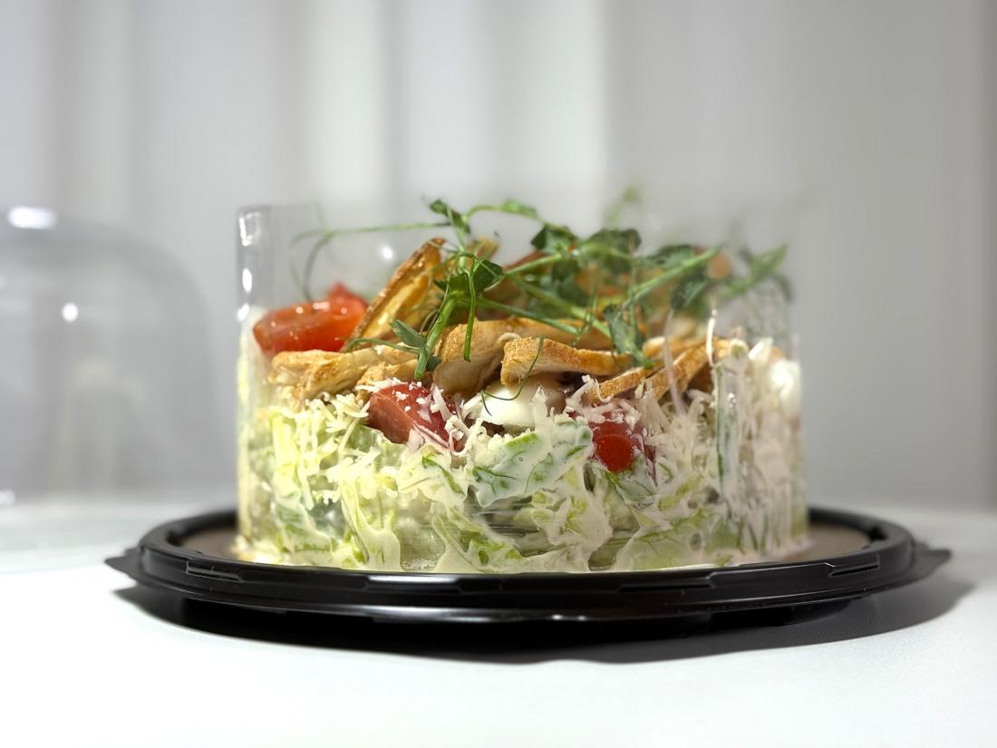 Салат в виде торта. Состав: Куриное филе гриль, черри, яйцо перепелиное, сыр Пармезан, салат «Айсберг», сухарики, соус «Цезарь», микрозелень.